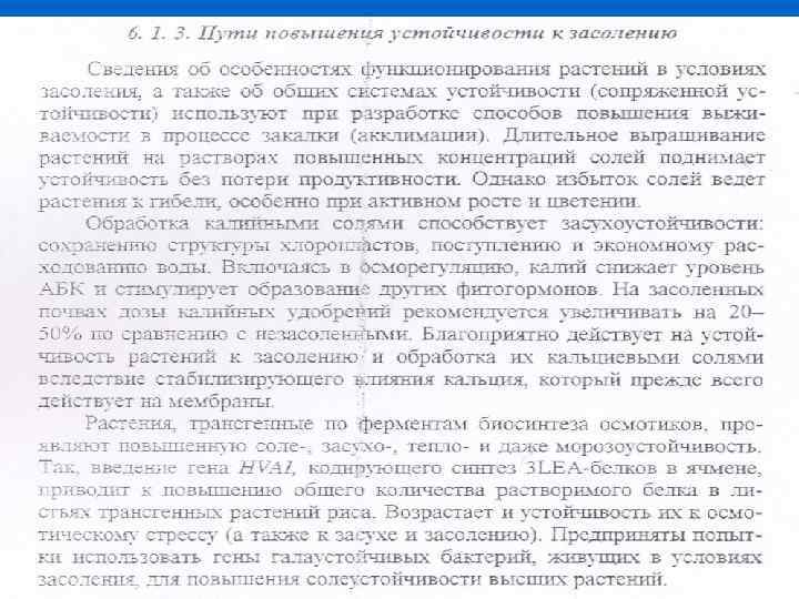 n n n n клеток табака и его пе лых растений, а также солеустойчивого сорта хлолчатюiка клппчен по молеклярной iассе осмотин. У. который птраст важн. УЮ роль в адаiгга. iдш растений не только к пзбытояиом засолению. но и к застхе. Аквалоргш. чей сквтез акгввкруется т арабидопсн: а и при засхе, и при засолещк гомологячен У растений и животкьос Ввеленис м. РКК ахвалоркьга растений в оотштьт Хепорi повьолает их лроiошаемос-ть для вольт. Следовательно, у растений л животных сгшеств; гют обкьне молекляркыё мехаквхньт посг. ттлеккя воды в клеткп. Это не лротнворечкг осморепляторной фтнклкн ваюош. в мембране которой также обнаружен аквалорки. Все сказанное свкдетедьствует о сходстве ответа клеток растений и других организмов на различные стрессовые воздействия. 6. 1. 3. Пу112 и УIовышения устойчив 19 ст/л к з. Коле. НИю Сведения об особенностях ф юшоняроваяня растений в условиях засолекия. а также об обшвх системах стойчявости (солряжеввой устойiлгвостл) лспользт при разработке способов повькаеккя вьгжкваемостк в прюпессе закалки (аккллмаiалг). длггельное выращивание растекяй на растворах повышенных кокаентрашiй солей поднимает стойчявость без потери лрюд’ттивностк Однако избьггок солей ведет растения к гибели, особенно при активном росте и пветекiаг Обработка каляйкьизак соязж способствует засухоустойчявости: сохаяеюгю стрткзхрьг хлороплiстов. посттстеккiо и экономному расходованию воды. Включаясь в осмореттлящло. калхй снижает ровевь АБК и с. ПВп. 1 кр. Ует образовакыа других фктогормонов. На засолеплых почвах дозы каляйаьхх удобрехй рекомекдетсл твелячiгвать на 20— 0% по сравнению с незасолекяьвш. Благоприятно действует на устойтшвость растений к засалешгю л обработка их калькиевьгил солязiя вследствие стабилизир. Ую шего ляякия кальдяя, который прежде всего де йств ст на мембракьт. Растения. траясгетоiьте по ферментам биоскятеза осзтотвков. проявл. юот повы еяктю соле-. зас. Ухо-, тепло- и даже морозостойчквость. Так. ввелегтоiе ге. аа КИ 4 I, кодыруюшего скатез 31 ЕА-белков в ячменс, приводит к повышению общего количества растворимого белка в лястьях трансгелгых рас-гений рига. Возрастает я устойчивость их к осмоткческом стресст (а также к застке и засолеккю). Предприняты польггки использовать гекы галатстойчiгвых бактергiй, жквтщях в условиях засолеюгя. для повьааеюiя соаеустойчквостк высших растений. 180
