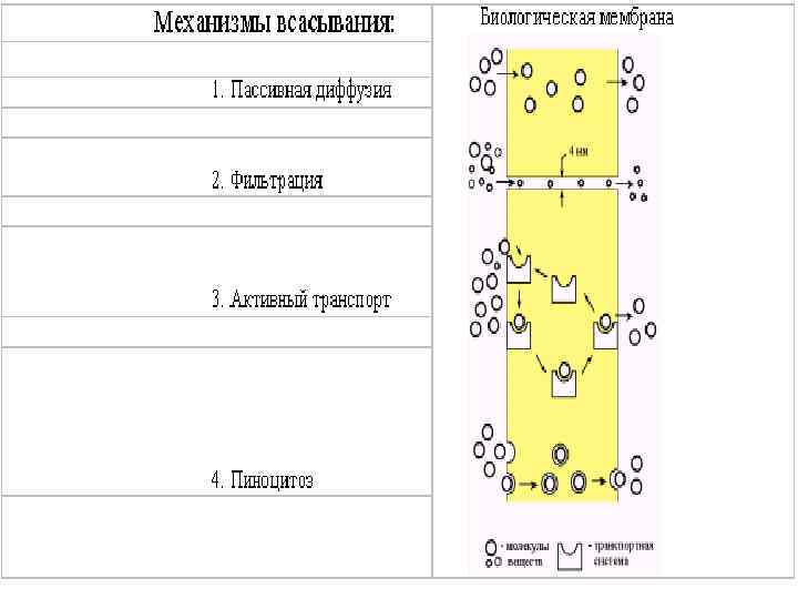 Всасывание (абсорбция – от лат. absorbeo – всасываю) – процесс поступления лекарственного вещества из места введения в кровеносную и/или лимфатическую систему через биологические мембраны. Всасывание осуществляется нескольким механизмам: по