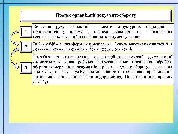 Документооборот це сукупність робіт зі – створення, перевірки, обробки та зберігання документації від моменту її складання до передачі в архів. Організація документообороту є складовою організації бухгалтерського обліку, яка забезпечує: • впорядкування руху первинних документів; • оптимальну кількість підрозділів і виконавців, через які повинен пройти кожен первинний документ; • визначення максимального терміну перебування документу в кожному підрозділі (в окремого виконавця); • стабільність роботи бухгалтерської служби та підвищення продуктивності праці облікових працівників.