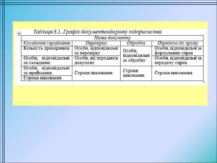 Графік документообороту затверджений – це порядок обробки інформаційних даних, зазначених у первинних документах. Даний документ повинен регламентувати: • строки складання, надання та обробки первинних документів; • перелік документів; • терміни їх просування та обробки; • посадових осіб, відповідальних за складання документів; • порядок передачі документів для обробки; • строки надходження документів до бухгалтерської служби від працівників інших підрозділів підприємства.