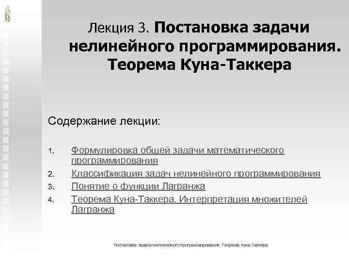 Литература n Шелобаев С. И. Экономико-математические методы и модели: Учеб. пособие для вузов. — 2 -е изд. М. : ЮНИТИ-ДАНА, 2005. — Разделы 4. 1 (до начала подраздела «Аналитические методы решения задач условной оптимизации» ), 4. 2. n Исследование операций в экономике: Учебн. пособие для вузов / Под ред. Н. Ш. Кремера. М. : Банки и биржи, ЮНИТИ, 1997. — Разделы 10. 2, 11. 2. Постановка задачи нелинейного программирования. Теорема Куна-Таккера /11