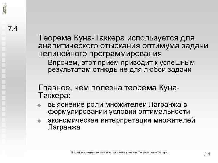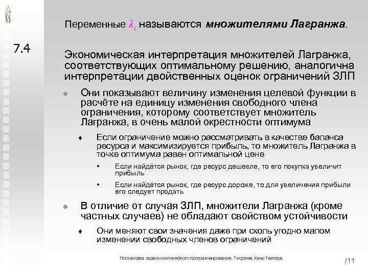 Переменные λi называются множителями Лагранжа. 7. 4 Экономическая интерпретация множителей Лагранжа, соответствующих оптимальному решению, аналогична интерпретации двойственных оценок ограничений ЗЛП u Они показывают величину изменения целевой функции в расчёте на единицу изменения свободного члена ограничения, которому соответствует множитель Лагранжа, в очень малой окрестности оптимума t Если ограничение можно рассматривать в качестве баланса ресурса и максимизируется прибыль, то множитель Лагранжа в точке оптимума равен оптимальной цене • • u Если найдётся рынок, где ресурс дешевле, то его покупка увеличит прибыль Если найдётся рынок, где ресурс дороже, то для увеличения прибыли его следует продать В отличие от случая ЗЛП, множители Лагранжа (кроме частных случаев) не обладают свойством устойчивости t Они меняют свои значения даже при сколь угодно малом изменении свободных членов ограничений Постановка задачи нелинейного программирования. Теорема Куна-Таккера /11