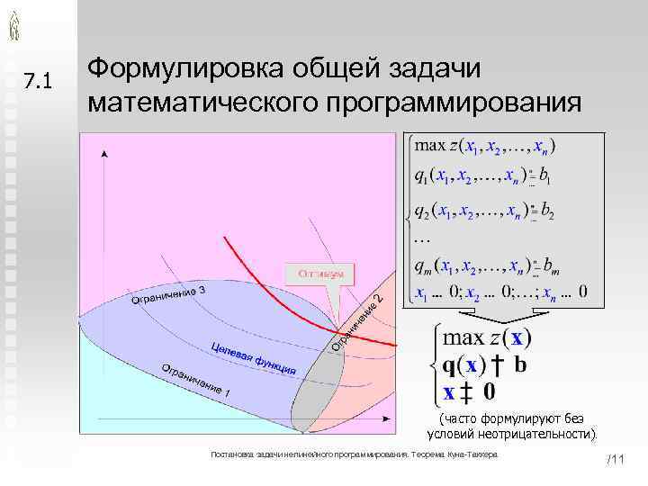 7. 1 Формулировка общей задачи математического программирования (часто формулируют без условий неотрицательности) Постановка задачи нелинейного программирования. Теорема Куна-Таккера /11