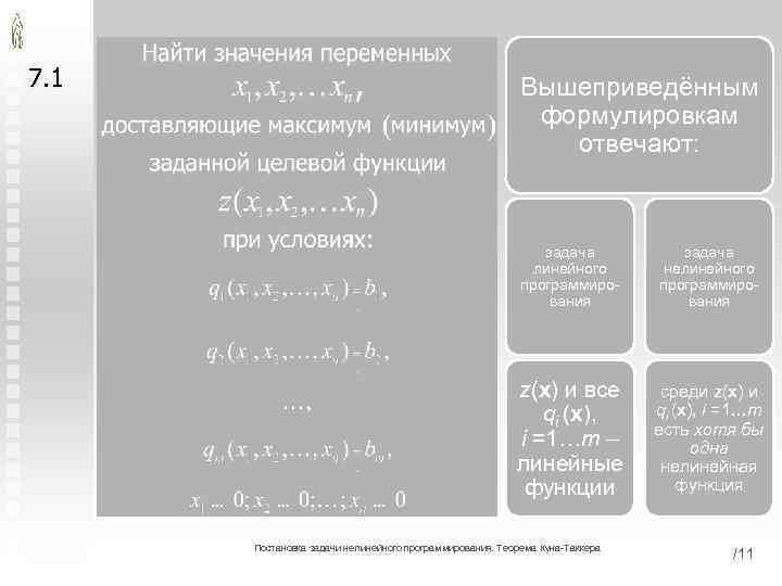 7. 1 Вышеприведённым формулировкам отвечают: задача линейного программирования задача нелинейного программирования z(x) и все qi (x), i =1…m – линейные функции среди z(x) и qi (x), i =1…m есть хотя бы одна нелинейная функция Постановка задачи нелинейного программирования. Теорема Куна-Таккера /11