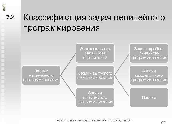 7. 2 Классификация задач нелинейного программирования Экстремальные задачи без ограничений Задачи выпуклого программирования Задачи квадратичного программирования Задачи невыпуклого программирования Задачи нелинейного программирования Задачи дробнолинейного программирования Прочие Постановка задачи нелинейного программирования. Теорема Куна-Таккера /11