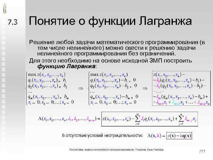 7. 3 Понятие о функции Лагранжа Решение любой задачи математического программирования (в том числе нелинейного) можно свести к решению задачи нелинейного программирования без ограничений. Для этого необходимо на основе исходной ЗМП построить функцию Лагранжа: В отсутствие условий неотрицательности: Постановка задачи нелинейного программирования. Теорема Куна-Таккера /11