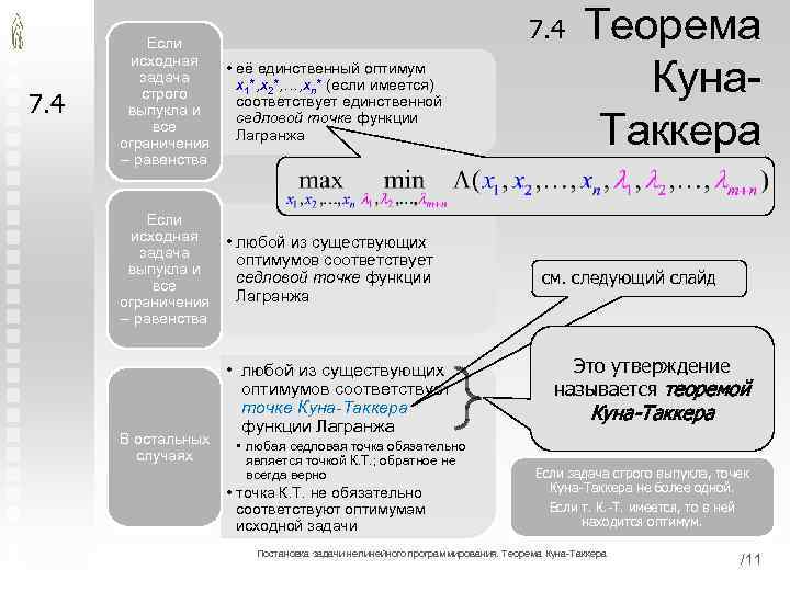 7. 4 Если исходная задача строго выпукла и все ограничения – равенства • её единственный оптимум x 1*, x 2*, …, xn* (если имеется) соответствует единственной седловой точке функции Лагранжа Если исходная задача выпукла и все ограничения – равенства • любой из существующих оптимумов соответствует седловой точке функции Лагранжа В остальных случаях • любой из существующих оптимумов соответствует точке Куна-Таккера функции Лагранжа • любая седловая точка обязательно является точкой К. Т. ; обратное не всегда верно • точка К. Т. не обязательно соответствуют оптимумам исходной задачи Теорема Куна. Таккера см. следующий слайд Это утверждение называется теоремой Куна-Таккера Если задача строго выпукла, точек Куна-Таккера не более одной. Если т. К. -Т. имеется, то в ней находится оптимум. Постановка задачи нелинейного программирования. Теорема Куна-Таккера /11
