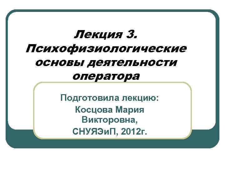 Лекция 3. Психофизиологические основы деятельности оператора Подготовила лекцию: Косцова Мария Викторовна, СНУЯЭи. П, 2012 г.
