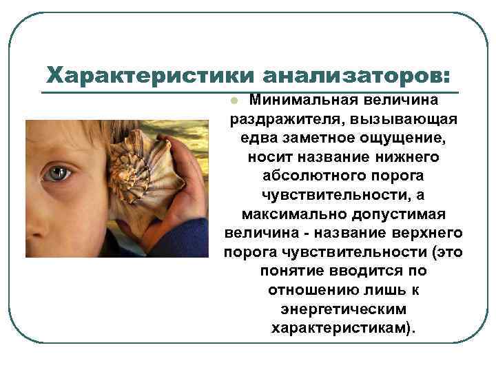 Характеристики анализаторов: Минимальная величина раздражителя, вызывающая едва заметное ощущение, носит название нижнего абсолютного порога чувствительности, а максимально допустимая величина - название верхнего порога чувствительности (это понятие вводится по отношению лишь к энергетическим характеристикам). l