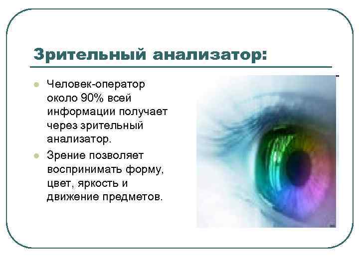 Зрительный анализатор: l l Человек-оператор около 90% всей информации получает через зрительный анализатор. Зрение позволяет воспринимать форму, цвет, яркость и движение предметов.