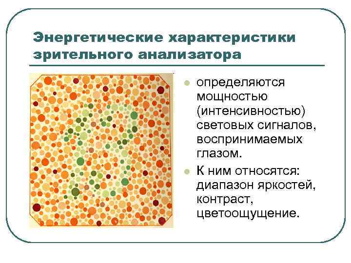 Энергетические характеристики зрительного анализатора l l определяются мощностью (интенсивностью) световых сигналов, воспринимаемых глазом. К ним относятся: диапазон яркостей, контраст, цветоощущение.