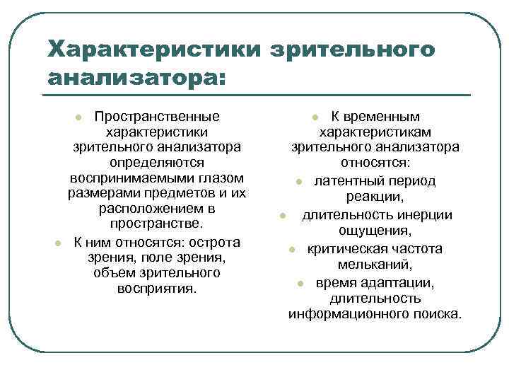 Характеристики зрительного анализатора: Пространственные характеристики зрительного анализатора определяются воспринимаемыми глазом размерами предметов и их расположением в пространстве. К ним относятся: острота зрения, поле зрения, объем зрительного восприятия. l l К временным характеристикам зрительного анализатора относятся: l латентный период реакции, l длительность инерции ощущения, l критическая частота мельканий, l время адаптации, длительность информационного поиска. l