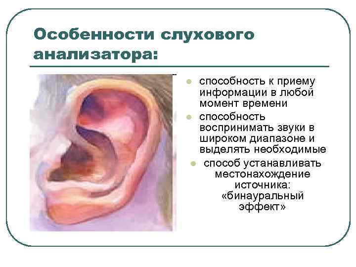 Особенности слухового анализатора: способность к приему информации в любой момент времени l способность воспринимать звуки в широком диапазоне и выделять необходимые l способ устанавливать местонахождение источника: «бинауральный эффект» l
