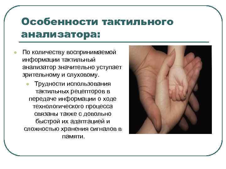 Особенности тактильного анализатора: l По количеству воспринимаемой информации тактильный анализатор значительно уступает зрительному и слуховому. l Трудности использования тактильных рецепторов в передаче информации о ходе технологического процесса связаны также с довольно быстрой их адаптацией и сложностью хранения сигналов в памяти.