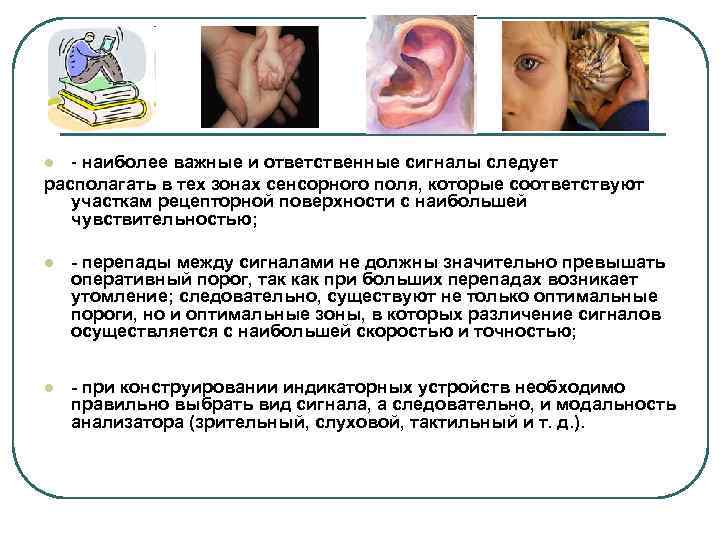 - наиболее важные и ответственные сигналы следует располагать в тех зонах сенсорного поля, которые соответствуют участкам рецепторной поверхности с наибольшей чувствительностью; l l - перепады между сигналами не должны значительно превышать оперативный порог, так как при больших перепадах возникает утомление; следовательно, существуют не только оптимальные пороги, но и оптимальные зоны, в которых различение сигналов осуществляется с наибольшей скоростью и точностью; l - при конструировании индикаторных устройств необходимо правильно выбрать вид сигнала, а следовательно, и модальность анализатора (зрительный, слуховой, тактильный и т. д. ).