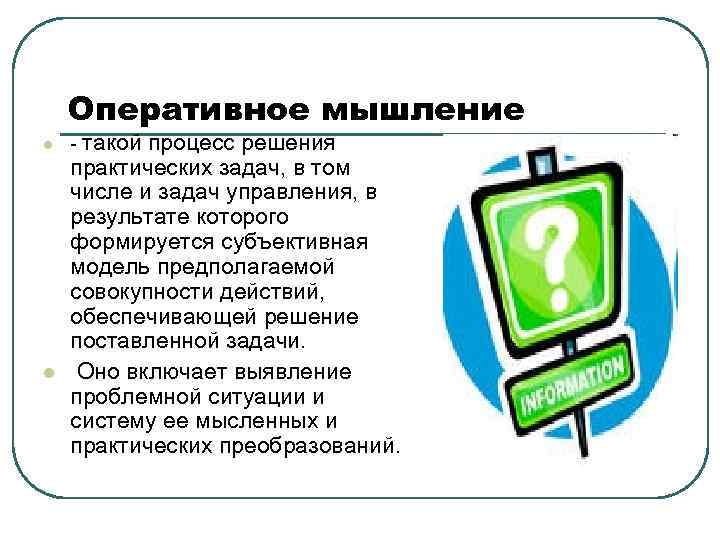 Оперативное мышление l l - такой процесс решения практических задач, в том числе и задач управления, в результате которого формируется субъективная модель предполагаемой совокупности действий, обеспечивающей решение поставленной задачи. Оно включает выявление проблемной ситуации и систему ее мысленных и практических преобразований.