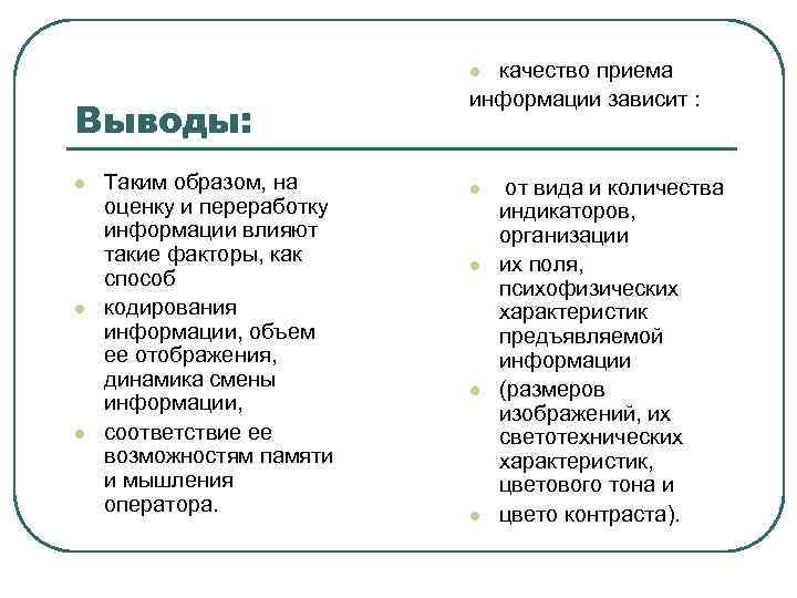 качество приема информации зависит : l Выводы: l l l Таким образом, на оценку и переработку информации влияют такие факторы, как способ кодирования информации, объем ее отображения, динамика смены информации, соответствие ее возможностям памяти и мышления оператора. l l от вида и количества индикаторов, организации их поля, психофизических характеристик предъявляемой информации (размеров изображений, их светотехнических характеристик, цветового тона и цвето контраста).