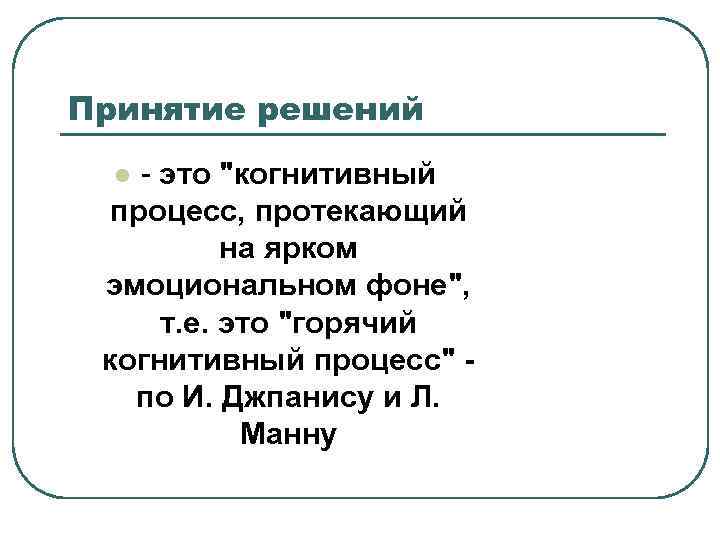 Принятие решений - это "когнитивный процесс, протекающий на ярком эмоциональном фоне", т. е. это "горячий когнитивный процесс" по И. Джпанису и Л. Манну l