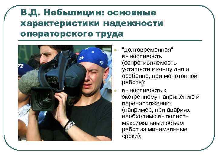 В. Д. Небылицин: основные характеристики надежности операторского труда l l "долговременная" выносливость (сопротивляемость усталости к концу дня и, особенно, при монотонной работе); выносливость к экстренному напряжению и перенапряжению (например, при авариях необходимо выполнять максимальный объем работ за минимальные сроки);