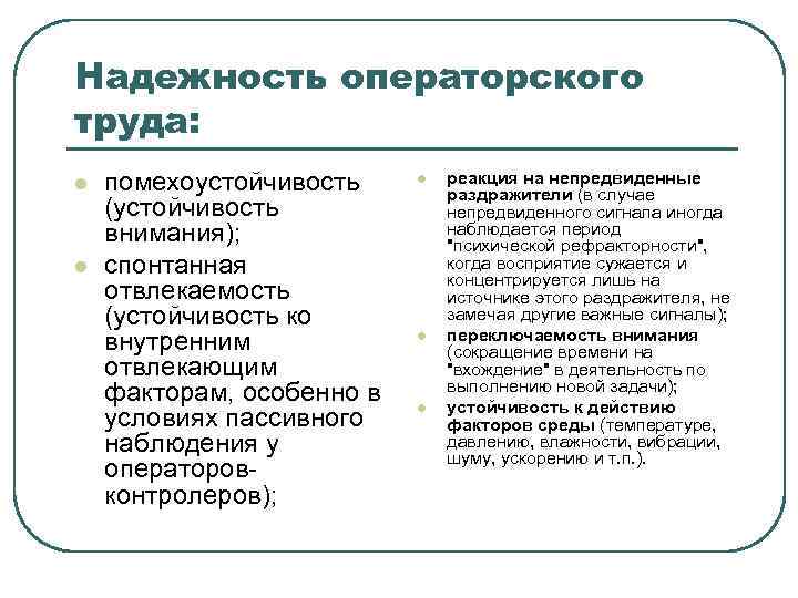 Надежность операторского труда: l l помехоустойчивость (устойчивость внимания); спонтанная отвлекаемость (устойчивость ко внутренним отвлекающим факторам, особенно в условиях пассивного наблюдения у операторовконтролеров); l l l реакция на непредвиденные раздражители (в случае непредвиденного сигнала иногда наблюдается период "психической рефракторности", когда восприятие сужается и концентрируется лишь на источнике этого раздражителя, не замечая другие важные сигналы); переключаемость внимания (сокращение времени на "вхождение" в деятельность по выполнению новой задачи); устойчивость к действию факторов среды (температуре, давлению, влажности, вибрации, шуму, ускорению и т. п. ).
