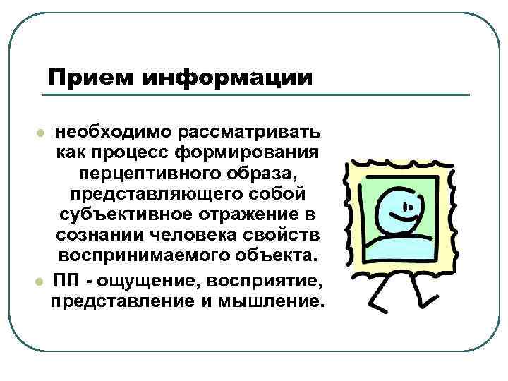 Прием информации l l необходимо рассматривать как процесс формирования перцептивного образа, представляющего собой субъективное отражение в сознании человека свойств воспринимаемого объекта. ПП - ощущение, восприятие, представление и мышление.