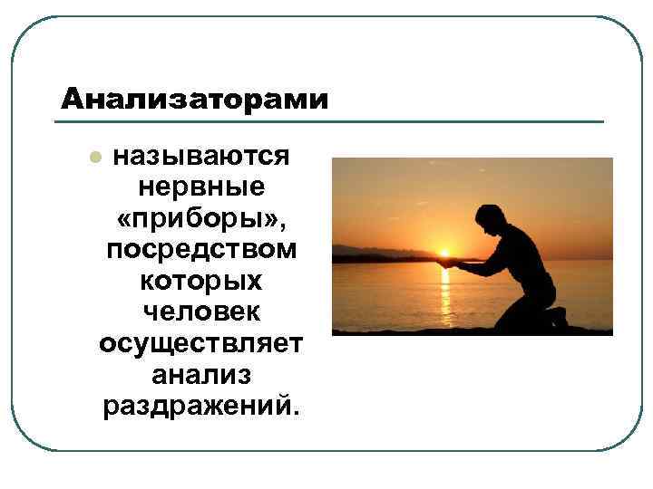 Анализаторами называются нервные «приборы» , посредством которых человек осуществляет анализ раздражений. l
