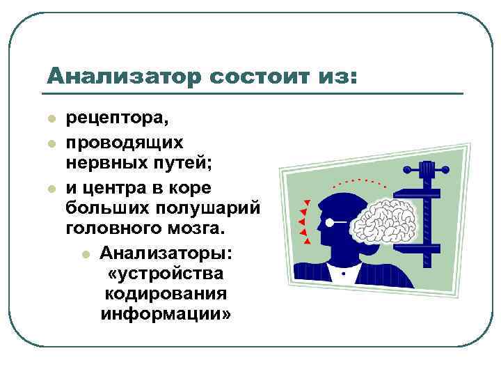 Анализатор состоит из: l l l рецептора, проводящих нервных путей; и центра в коре больших полушарий головного мозга. l Анализаторы: «устройства кодирования информации»