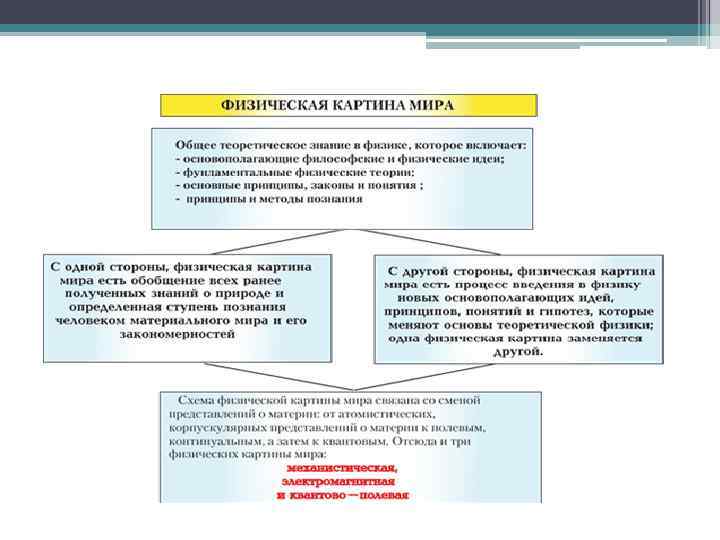 С XVII по XIX вв. большинство ученых вдохновлялось идеалом механической картины мира: все явления неживой природы происходят в ньютоновских пространстве и времени и представляют собой результат действующих с необходимостью сил, приложенных к некоторым элементарным объектам. Трудности построения такой картины мира, с которыми столкнулась физика в начале XX в , привели, как известно, к попыткам: — с одной стороны, построения единой физической картины мира на базе электродинамики, — с другой стороны, построения универсальной вероятностной физической картины мира.