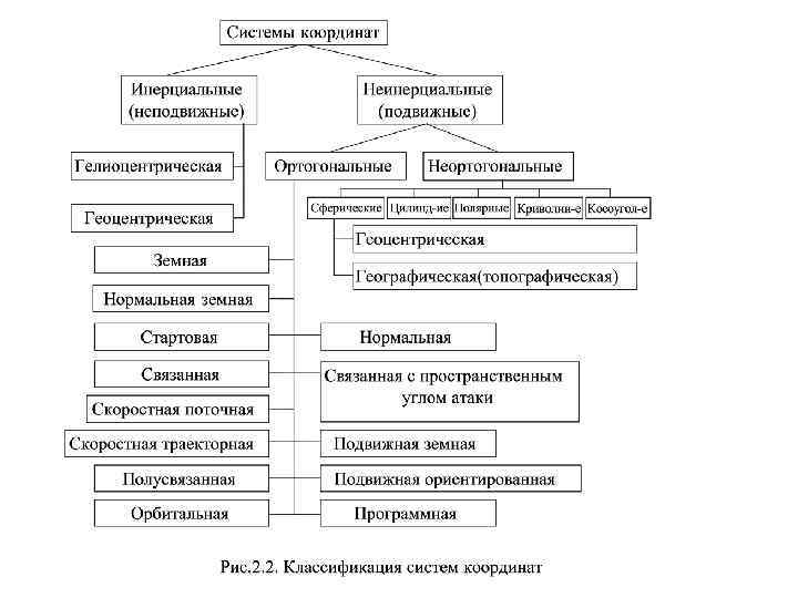 ЛЕКЦИЯ № 3 ТЕМА 2. МАТЕМАТИЧЕСКИЕ МОДЕЛИ ДВИЖЕНИЯ ЛЕТАТЕЛЬНОГО АППАРАТА КАК ОБЪЕКТА УПРАВЛЕНИЯ 2. 2. Основные системы координат в динамике полета Для анализа движения ЛА и получения характеристик его устойчивости и управляемости необходимо ввести системы координат, в которых можно рассматривать это движение. Системы координат разделяют на два класса: инерциальные (неподвижные), неинерциальные (подвижные). Группы систем координат по расположению начала : связанные с Землей или другими точками пространства системы координат, связанные с ЛА Системы координат по взаимному положению осей с ортогональными прямыми осями, правые декартовые системы координат косоугольные системы координат (с неортогональными осями) - сферические, - цилиндрические и - полярные системы координат.