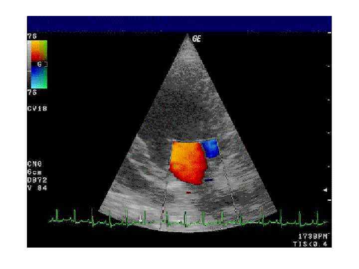 Цветовой допплер (Color Doppler) • выделение на эхограмме цветом (цветное картирование) характера кровотока в области интереса. • Кровоток к датчику принято картировать красным цветом, от датчика - синим цветом. • Турбулентный кровоток картируется сине-зеленожелтым цветом. • Цветовой допплер применяется для исследования кровотока в сосудах, в эхокардиографии.