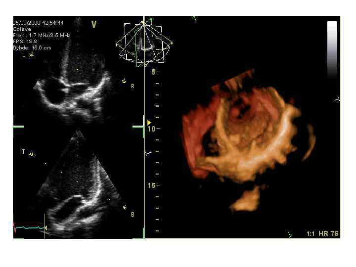 Двухмерная эхокардиография (В-режим) позволяет в реальном времени оценить • • • размеры полостей сердца, толщину стенок желудочков, состояние клапанного аппарата, подклапанных структур, глобальную и локальную сократимость желудочков, • наличие тромбоза полостей • и т. д.