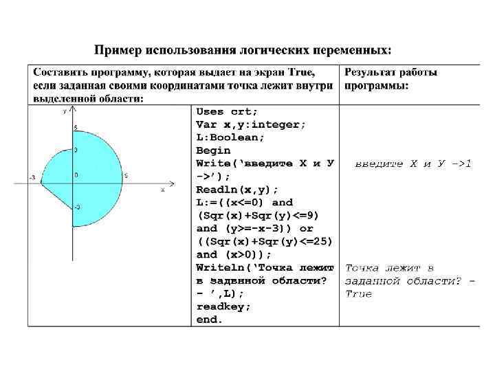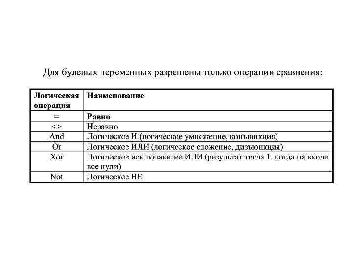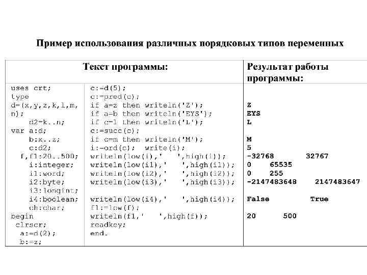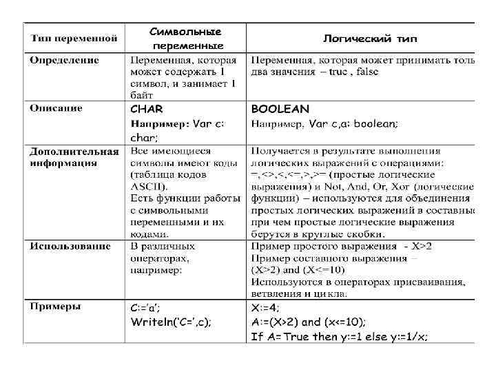 3. Порядковые типы переменных • Кроме числовых переменных возможно использование символьных, логических и простых типов переменных, определяемых программистом: перечисляемых и интервальных (тип – диапазон). • Символьные переменные описываются как CHAR и представляют собой тип данных, предназначенный для хранения одного символа (буква, знак, код). Переменная типа CHAR занимает один байт. • Логические переменные (тип Boolean) – это переменные, которые могут принимать только два значения истина - true (1) или ложь - false (0). Используются такие переменные для хранения результатов логических вычислений.