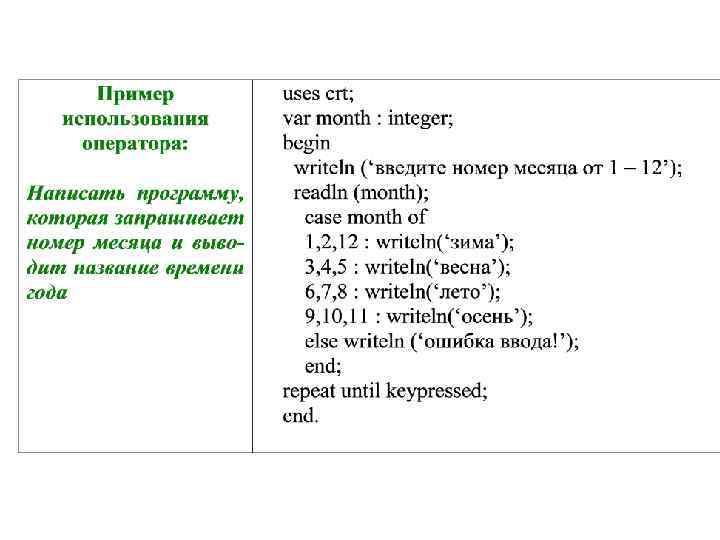 Нестандартные операторы • Оператор очистки экрана: Clrscr; Оператор требует подключения (Uses crt; ) модуля crt, например: Uses crt; Begin Clrscr; … End. • Оператор перемещения текстового курсора в заданный символ x строки y: gotoxy(x, y); • Оператор изменения фона экрана (цвет фона): Textbackground(. . . ); Чтобы очистился весь экран, после оператора textbackground должен следовать оператор clrscr. В противном случае фон меняется только под текущей строкой. • Оператор изменения цвета переднего плана (цвет букв): Textcolor(. . . ); Uses crt; Begin Textbackground (yellow); clrscr; … Textcolor(blue); … End.