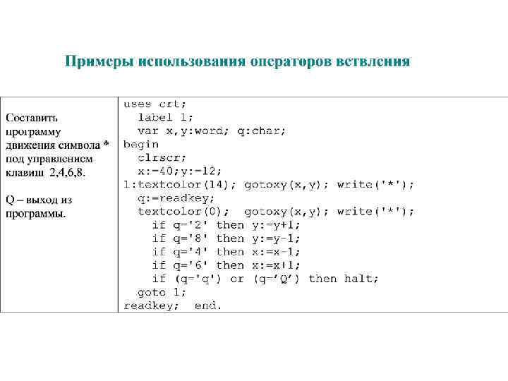 Операторы безусловного перехода: goto <метка> перейти к halt [<код>] выход из программы
