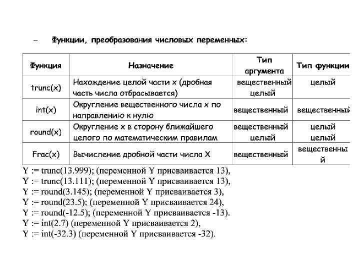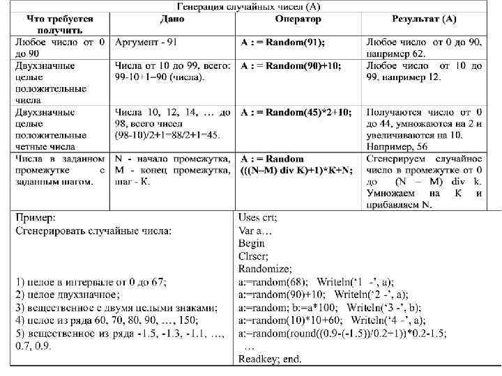 Получение случайных чисел – Random – получение (генерация) случайных чисел в диапазоне от 0 до 1. Например, Y : = random; (переменной Y присваивается значение равное числу из промежутка от 0 до 1, возможно 0. 45678). – Random(X) - Получение случайных целых чисел в диапазоне от 0 до (Х-1). Аргумент Х - целое. Например, Y : =Random(39); (переменной Y присваивается значение равное числу из промежутка от 0 до 38). – Randomize - Формирование базы случайных чисел, на основе временного таймера ПК. Должен стоять в программе до первого использования функции Random.