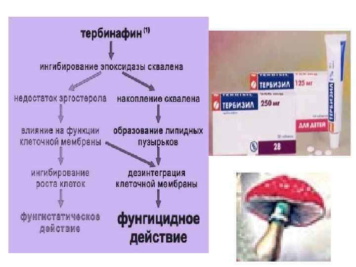 Аллиламины Синтет-е антимикотики: тербинафин внутрь и местно, нафтифин местно. Показания для аллиламинов дерматомикозы. Механизм: А обладают преимущ. фунгицидным д-ем, связ-м с наруш-м синтеза эргостерола. В отличие от азолов А блок. >ранние ст. биосинтеза, ингиб. Ф скваленэпоксидазу. А широк. спектр: чувств-ны дерматомицеты (Epidermophyton spp. , Trichophyton spp. , Micro-sporum spp. ), M. furfur, кандиды, аспергиллы, гистоплазмы, бластомицеты, криптококк, споротрикс, возб. хромомикоза. Тербинафин акт. in vitro против простейших (некот. лейшманий и трипаносом). Клин-е знач-е д-е на возб-й дерматомикозов. ФК: Т хорошо → в ЖКТ, биодоступ. не зависит от приема пищи. На 99% связся с белками. ↑липофильность, Т → во мн. ткани. создает ↑ конц. в роговом слое эпидермиса, ногт. пластинках, волос. фолликулах, волосах. Метаб-ся в печени, → почками. Т 1/2=11 -17 ч, ↑при ХПН. При мест. Прим-и системная абсорбция Т <5%, нафтифина -4– 6%. Препараты создают ↑конц-и в различ. слоях кожи, превыш-е МПК для основных возб-й дерматомикозов. Всосавшаяся порция нафтифина частично метаб-ся в печени, →с мочой и с калом. Т 1/2=2– 3 дня.