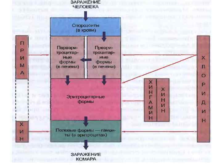 Пре. Эр-е ф-мы: хлоридин Производное 8 -аминохинолина примахин: влияет на пара. Эр-е ф-мы+ на половые ф-мы (гамонтоцидное д-е). Показания: предупр-е рецид-в 3 -х дн. М. и распростр. М. При наслед. Недостат-ти Г-6 -ФДГ- гемолиз, агранулоцитоз. Дей-е на половые клетки-примахин (гамонтоцидное), Хлоридин-гамонтостатическое. Половые клетки или гибнут или нарушается процесс спорогонии.
