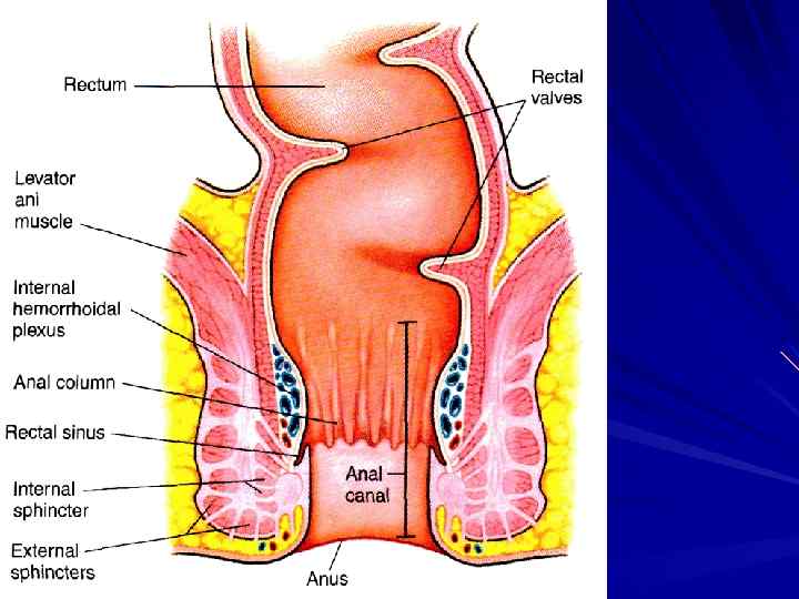 СФИНКТЕРЫ RECTUM ВНУТРЕННИЙ – ГЛАДКИЕ МЫШЦЫ НАРУЖНЫЙ – ПОПЕРЕЧНОПОЛОСАТЫЕ МЫШЦЫ (СРАМНОЙ НЕРВ)
