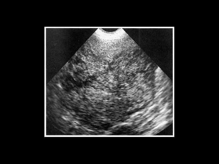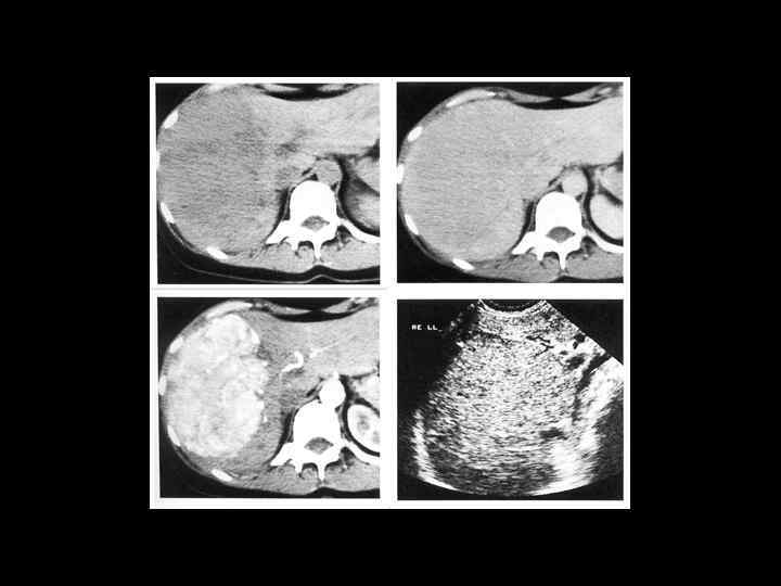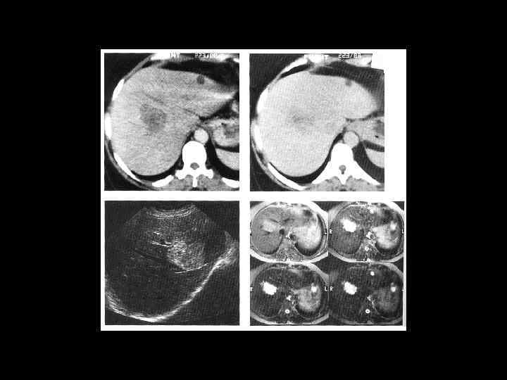 АКТУАЛЬНЫЕ ВОПРОСЫ РЕНТГЕНОЛОГИИ ЛУЧЕВАЯ ДИАГНОСТИКА ОЧАГОВЫХ ПОРАЖЕНИЙ ПЕЧЕНИ ЗЛОКАЧЕСТВЕННЫЕ ОПУХОЛИ ПЕЧЕНИ Гепатоцеллюлярный рак (гепатома) Ультразвуковая семиотика: - участок неровномерной плотности (чередование гипо- и гиперэхогенной структуры) - с неровными контурами - распад в опухоли (в центре) выглядит как эхонегативная зона - отек вокруг опухоли - расплывчатый ободок эхонегативной зоны