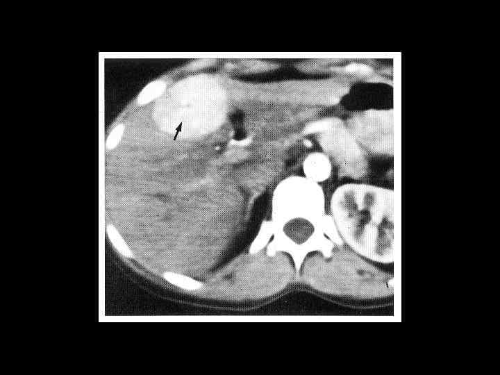 АКТУАЛЬНЫЕ ВОПРОСЫ РЕНТГЕНОЛОГИИ ЛУЧЕВАЯ ДИАГНОСТИКА ОЧАГОВЫХ ПОРАЖЕНИЙ ПЕЧЕНИ МЕТАСТАТИЧЕСКОЕ ПОРАЖЕНИЕ ПЕЧЕНИ Компьютерно-томографическая семиотика: - образования имеющие как правило низкую плотность (30 -50 ед Н), которая мало изменяется или вовсе не изменяется после введения РКВ (наибольшее усиление дают метастазы гипернефромы)