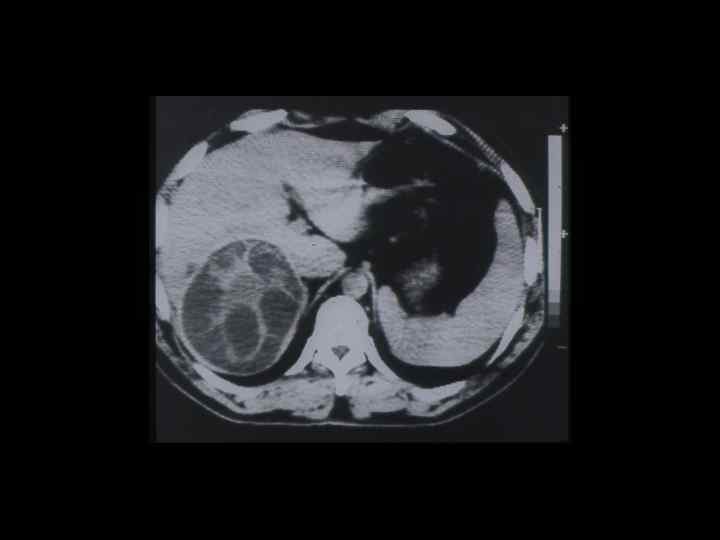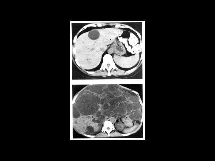 АКТУАЛЬНЫЕ ВОПРОСЫ РЕНТГЕНОЛОГИИ ЛУЧЕВАЯ ДИАГНОСТИКА ОЧАГОВЫХ ПОРАЖЕНИЙ ПЕЧЕНИ ЭХИНОКОККОВЫЕ КИСТЫ УЗИ: краевые кольцевидные обызвествления КТ: низкоплотностные образования с перегородками и четкими контурами МРТ: образования дающие гиперинтенсивный сигнал на Т 2 взвешенных изображениях