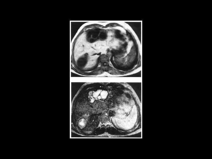 АКТУАЛЬНЫЕ ВОПРОСЫ РЕНТГЕНОЛОГИИ ЛУЧЕВАЯ ДИАГНОСТИКА ОЧАГОВЫХ ПОРАЖЕНИЙ ПЕЧЕНИ Кавернозная гемангиома печени МР- семиотика: - образование с гиперинтенсивным сигналом на Т-2 взвешенном изображении -после введения контрастного вещества- динамика изменений такая же, как при КТ