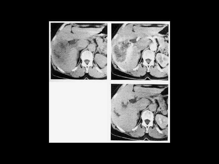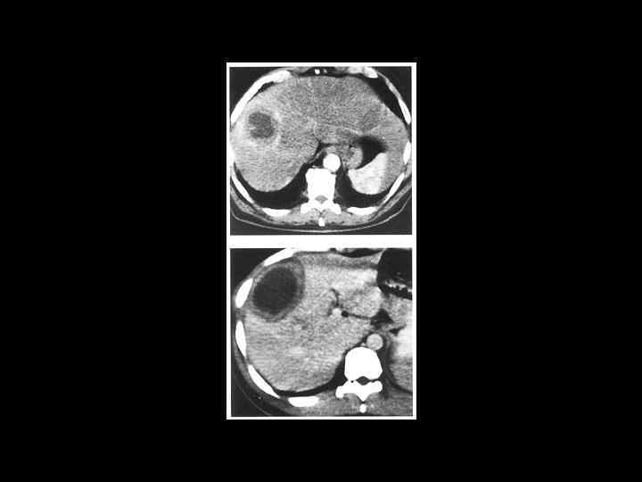 АКТУАЛЬНЫЕ ВОПРОСЫ РЕНТГЕНОЛОГИИ ЛУЧЕВАЯ ДИАГНОСТИКА ОЧАГОВЫХ ПОРАЖЕНИЙ ПЕЧЕНИ АБСЦЕСС ПЕЧЕНИ Компьютерно-томографическая семиотика: - образование низкой плотности (20 -30 ед. Н) - видна капсула с нечетким внутренним контуром - вокруг полости ободок измененной паренхимы - при введении РКВ - усиление изображения стенок