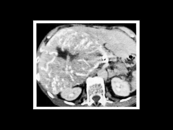 АКТУАЛЬНЫЕ ВОПРОСЫ РЕНТГЕНОЛОГИИ ЛУЧЕВАЯ ДИАГНОСТИКА ОЧАГОВЫХ ПОРАЖЕНИЙ ПЕЧЕНИ ЗЛОКАЧЕСТВЕННЫЕ ОПУХОЛИ ПЕЧЕНИ Гепатоцеллюлярный рак (гепатома) Компьютерно-томографическая семиотика: - дефект неправильной формы - с неровными, недостаточно четкими контурами - плотность равна или чуть ниже плотности неизмененной паренхимы - после контрастного усиления выраженная неравномерность структуры - часто присутствует инвазия в систему портальной или печеночной вены