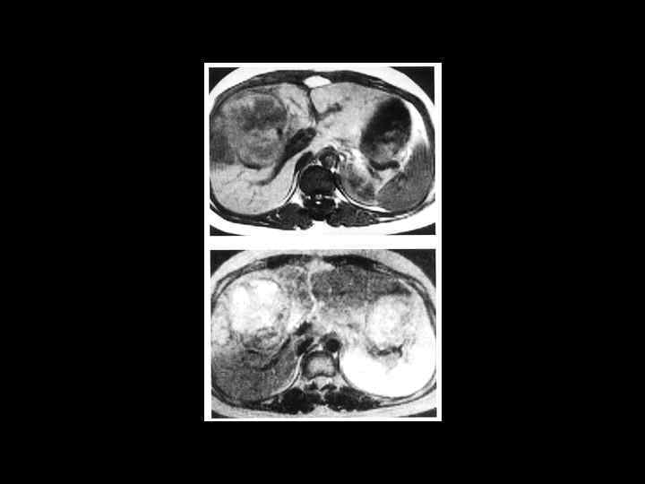 АКТУАЛЬНЫЕ ВОПРОСЫ РЕНТГЕНОЛОГИИ ЛУЧЕВАЯ ДИАГНОСТИКА ОЧАГОВЫХ ПОРАЖЕНИЙ ПЕЧЕНИ ЗЛОКАЧЕСТВЕННЫЕ ОПУХОЛИ ПЕЧЕНИ Гепатоцеллюлярный рак (гепатома) МР семиотика: Т 1 взвешенные изображения: - слабо-, изо- или слегка гиперинтенсивный сигнал - повышение сигнала - при богато васкуляризированной опухоли или жировом гепатозе - может визуализироваться ободок капсулы Т 2 взвешенные изображения - повышение интенсивности сигнала и четче видна граница с непораженной тканью После контрастного усиления опухоль видна более отчетливо