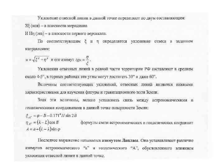 • Если нормаль проведена к общему земному эллипсоиду, уклонение отвесной линии называется абсолютным; если нормаль проведена к референц-эллипсоиду – уклонение называется относительным. • Величина относительного уклонения отвесной линии зависитот неравномерного распределения масс в теле Земли, от влияния погрешностей в размерах референц-эллипсоида и от влияния погрешностей ориентирования референц-эллипсоида в теле Земли. • Уклонение отвесной линии, определённый из сопостовления астрономических и геодезических координатданной точки, называется астрономо геодезическим уклонением отвесной линии. •