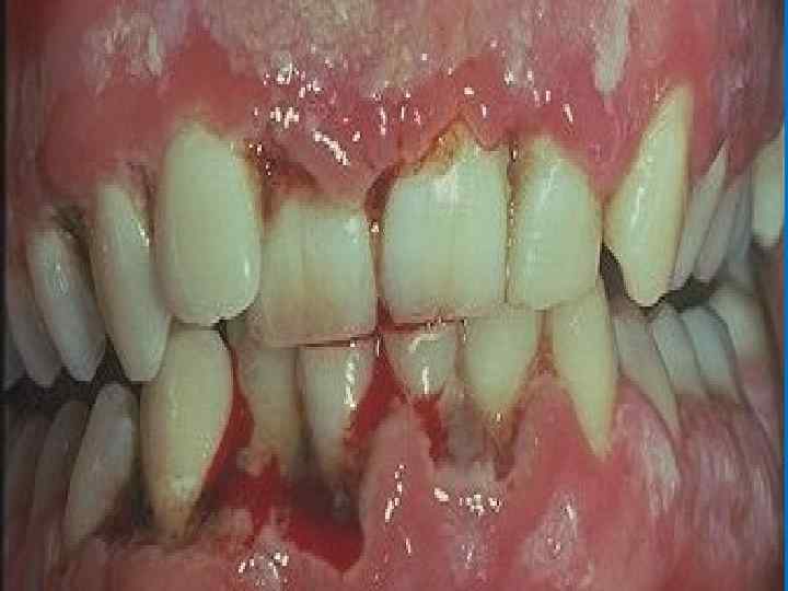 Язвенно-некротический гингивит Клинически: резкая боль, неприятный запах, кровоточивость десен, недомогание, повышение температуры, лейкоцитоз.