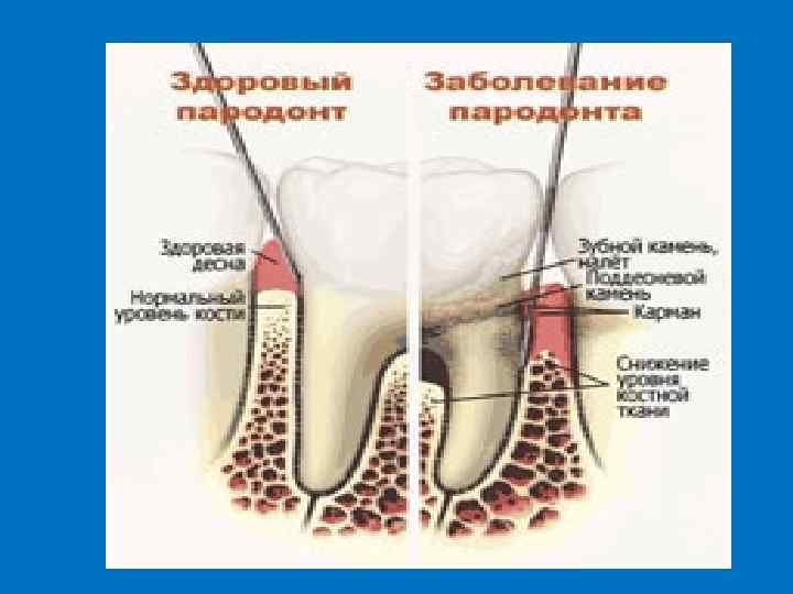 Пародонтит Поражение десны с надкостницей, цемента, связочного аппарата зуба, костной стенки зубной альвеолы, зубодесневого кармана, эпителиального прикрепления.