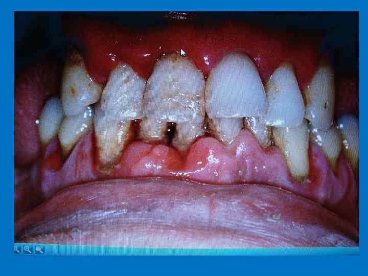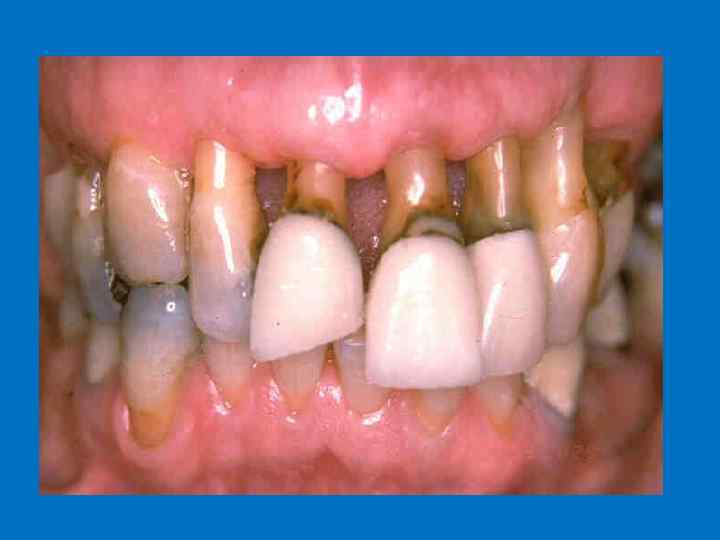 Пародонтоз тяжелой степени: -десневые сосочки полностью сглажены; -десна анемична; -корни зуба обнажены на 4 -5 мм; -резорбция костной ткани превышает 2 3 длины межальвеолярных перегородок; -бескровное выпадение зубов.