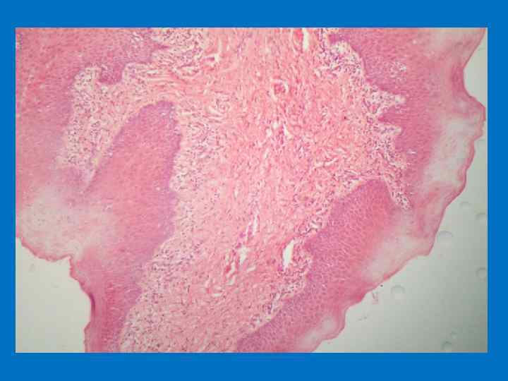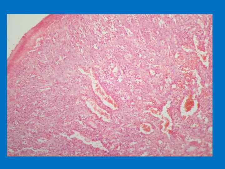 Язвенно-некротический гингивит Макроскопически: гиперемия с участками некроза, уменьшается или исчезает десневой сосочек. Микроскпически: эпителий истончен, изъязвлен, периваскулит, диффузная инфильтрация плазматических клеток, гистиоцитов, нейтрофилов.